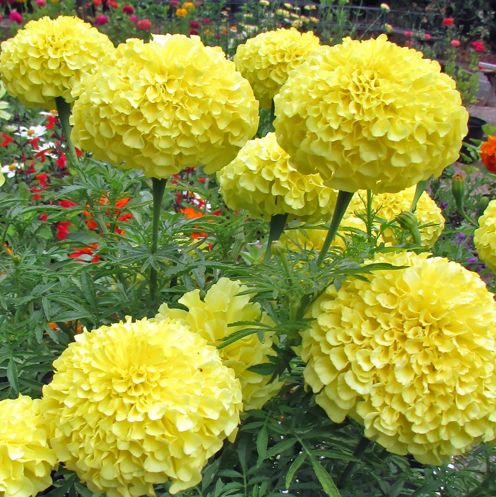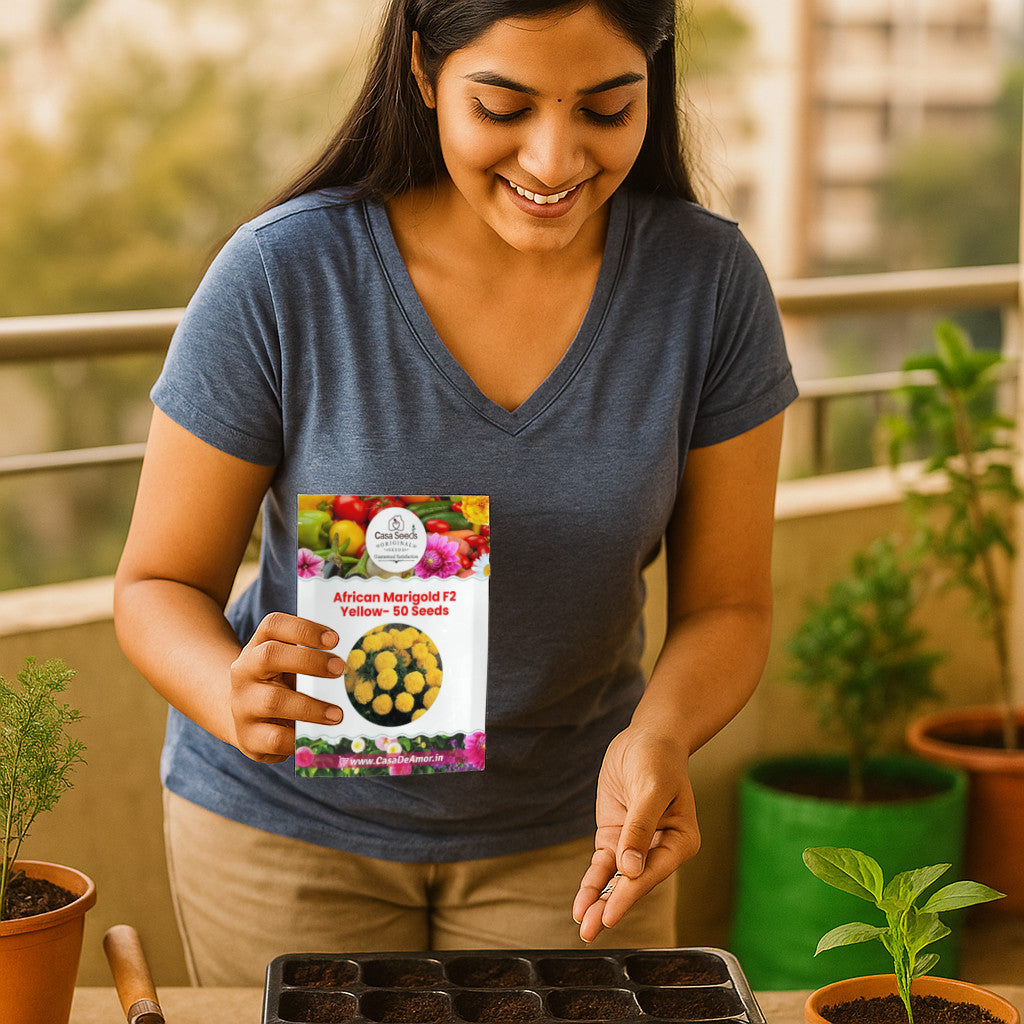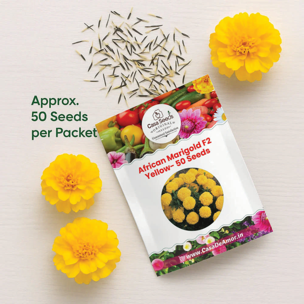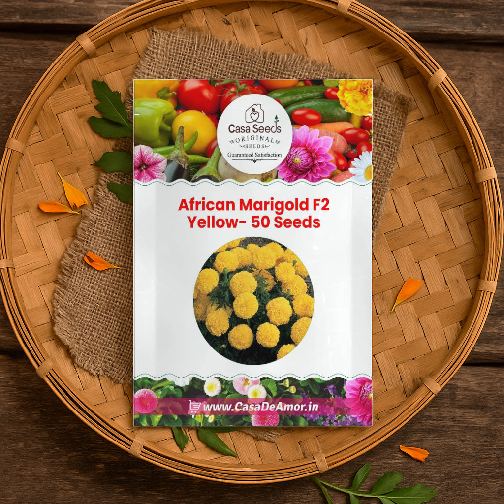 This Marigold is a dwarf plant of 25 cm in height with deep yellow compact flowers. Best for pots. Marigold African F2 Yellow is a Winter season flower, that can be sown in mild summers