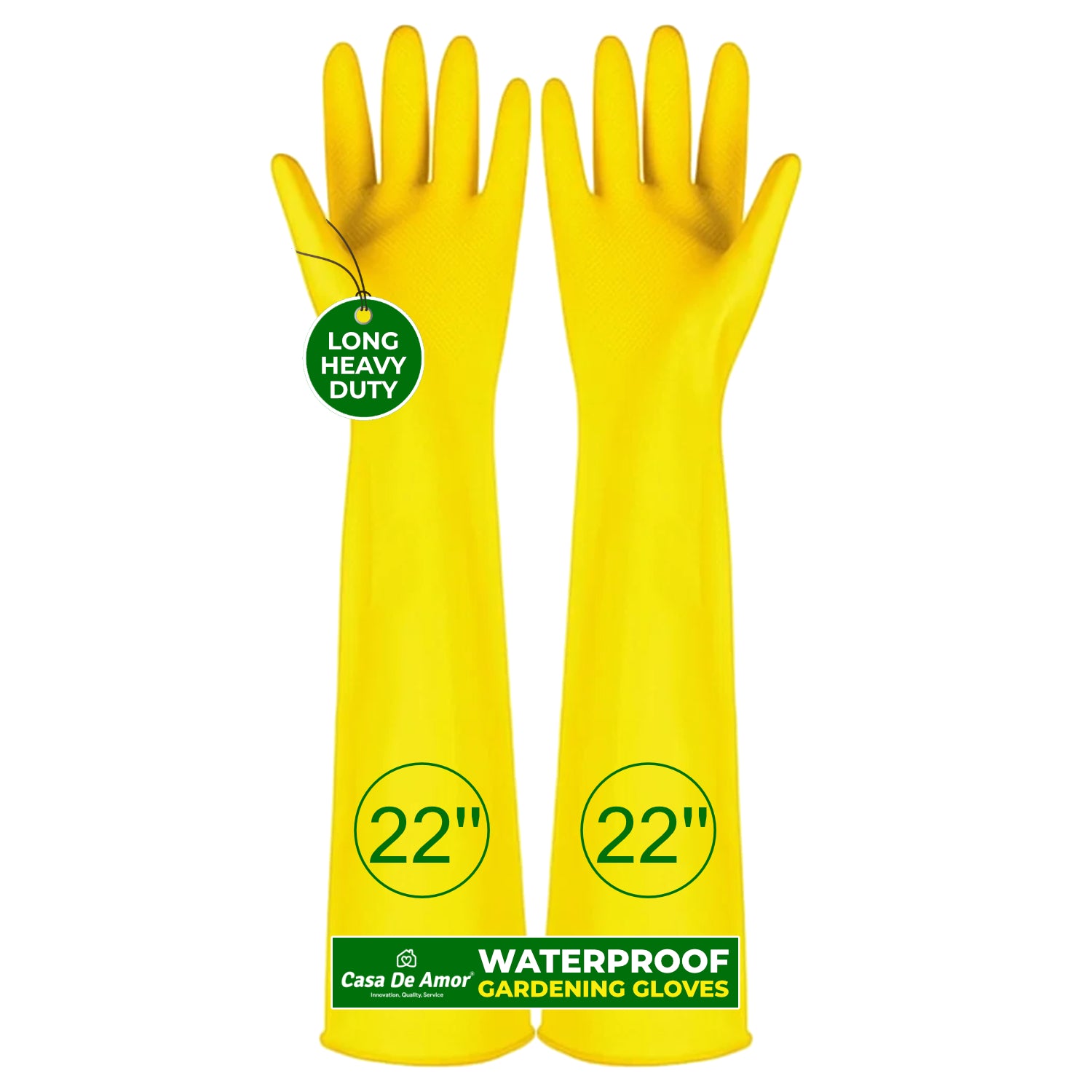 Casa De Amor Long Heavy Duty Latex Rubber Gardening Gloves – Waterproof & Reusable Garden Gloves for Home, Farming, Agriculture & Dairy Use – 0.55mm Thick, Yellow (1 Pair)