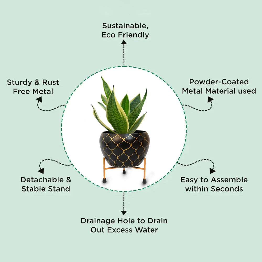 A beautifully classic metal planter with iron stand by The Casa De Amor comes to decorate your house exactly the way you want. You can pair the metal planter with a variety of plants like cacti, succulents, flowering plants, etc. to increase the charm of your corners. The iron stand with the metal planter lifts the pot that works in many ways - it makes watering plants easier, prevents your floor from damage, and also raises the plant that makes it appear taller. The exceptional quality of the metal planter with the iron stand makes it capable to hold even the heavier plants - an absolute solution for all your decor needs.