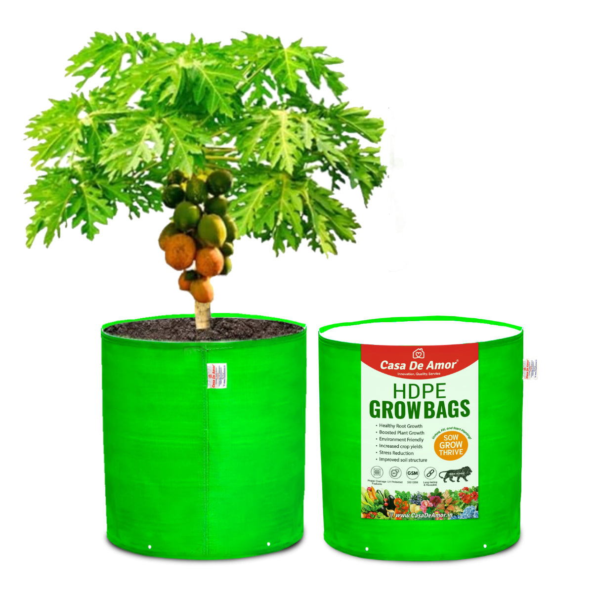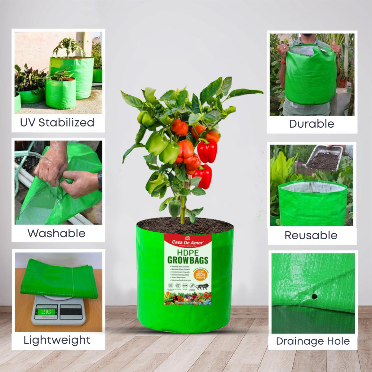 - Casa De Amor Grow bag made of sturdy high class 100% Virgin HDPE material is an ideal addition to your home garden or kitchen garden. The soft fabric makes it easy to fold up for storage when not in use and it is a long-lasting reliable, high-strength bag for gardening. Casa De Amor grows bag is perfect for terraces, small gardens, balconies, sunrooms, and any indoor/outdoor space. They are used in plants and vegetables. Thick, durable and UV-treated grow bag for longer life in hot and cold weather. Suitable for growing all types of vegetables, fruits, and flower plants.