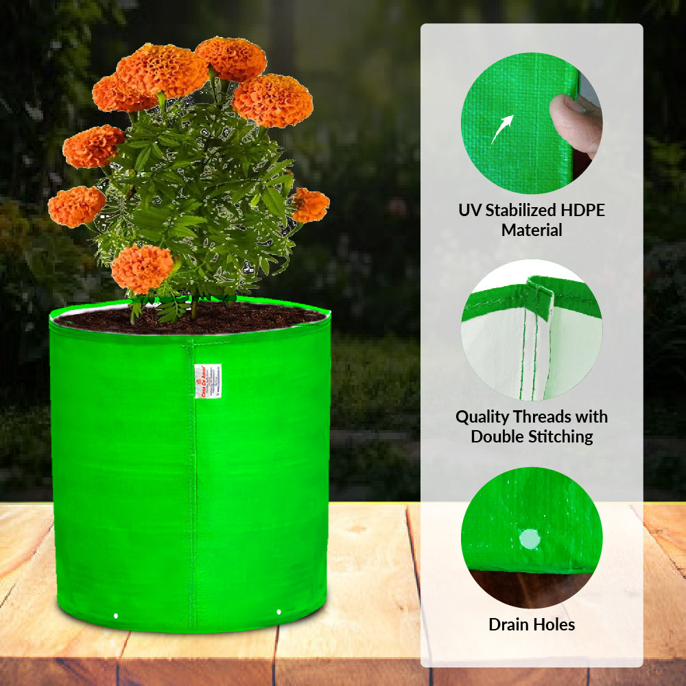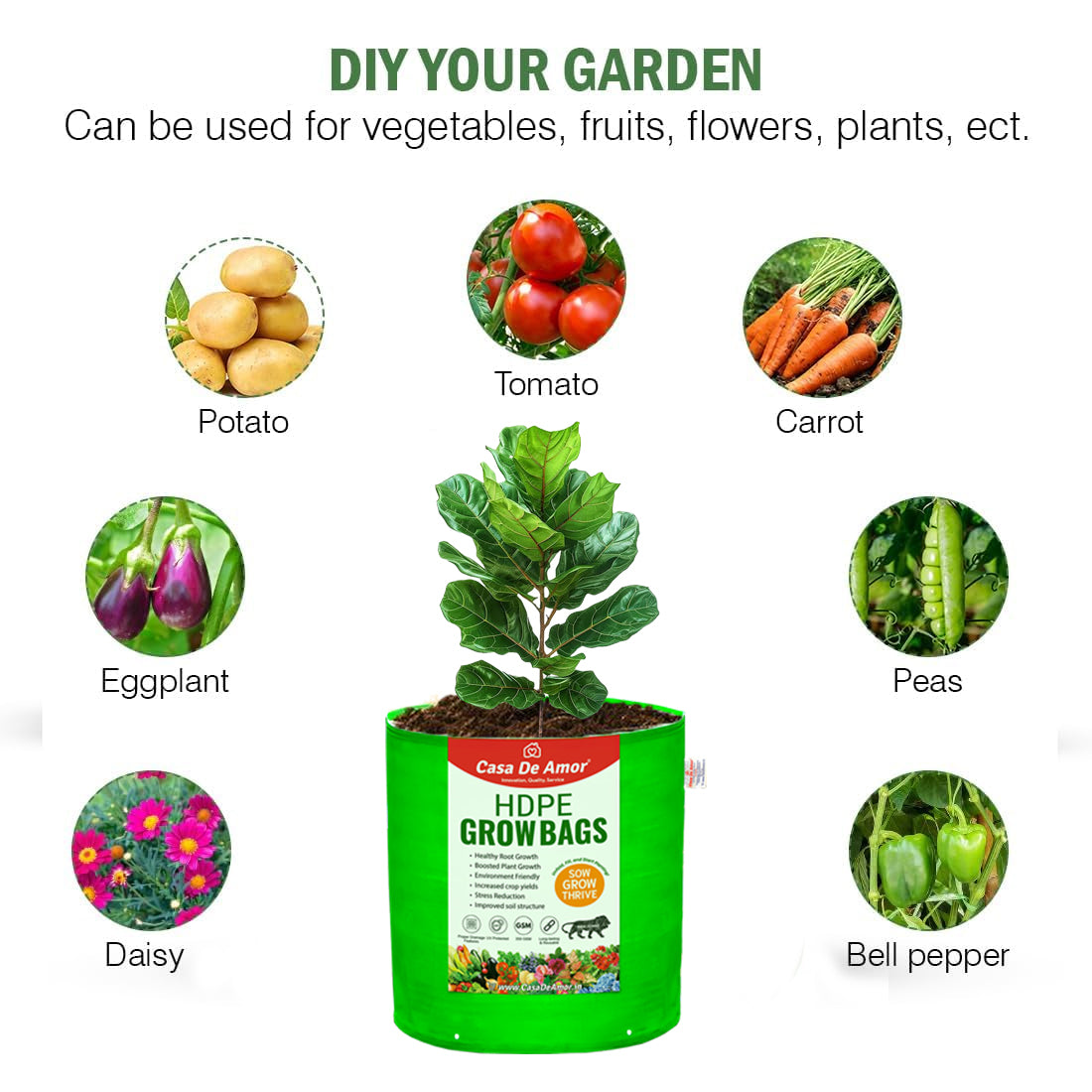 - Casa De Amor Grow bag made of sturdy high class 100% Virgin HDPE material is an ideal addition to your home garden or kitchen garden. The soft fabric makes it easy to fold up for storage when not in use and it is a long-lasting reliable, high-strength bag for gardening. Casa De Amor grows bag is perfect for terraces, small gardens, balconies, sunrooms, and any indoor/outdoor space. They are used in plants and vegetables. Thick, durable and UV-treated grow bag for longer life in hot and cold weather. Suitable for growing all types of vegetables, fruits, and flower plants.