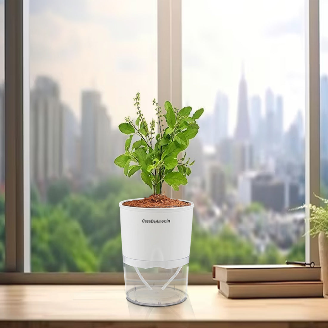 Casa De Amor Tulsi Plant with White Self-Watering Pot | Live Air Purifier Plant for Home Decor | Perfect for Living Room, Bedroom, Office, and Garden