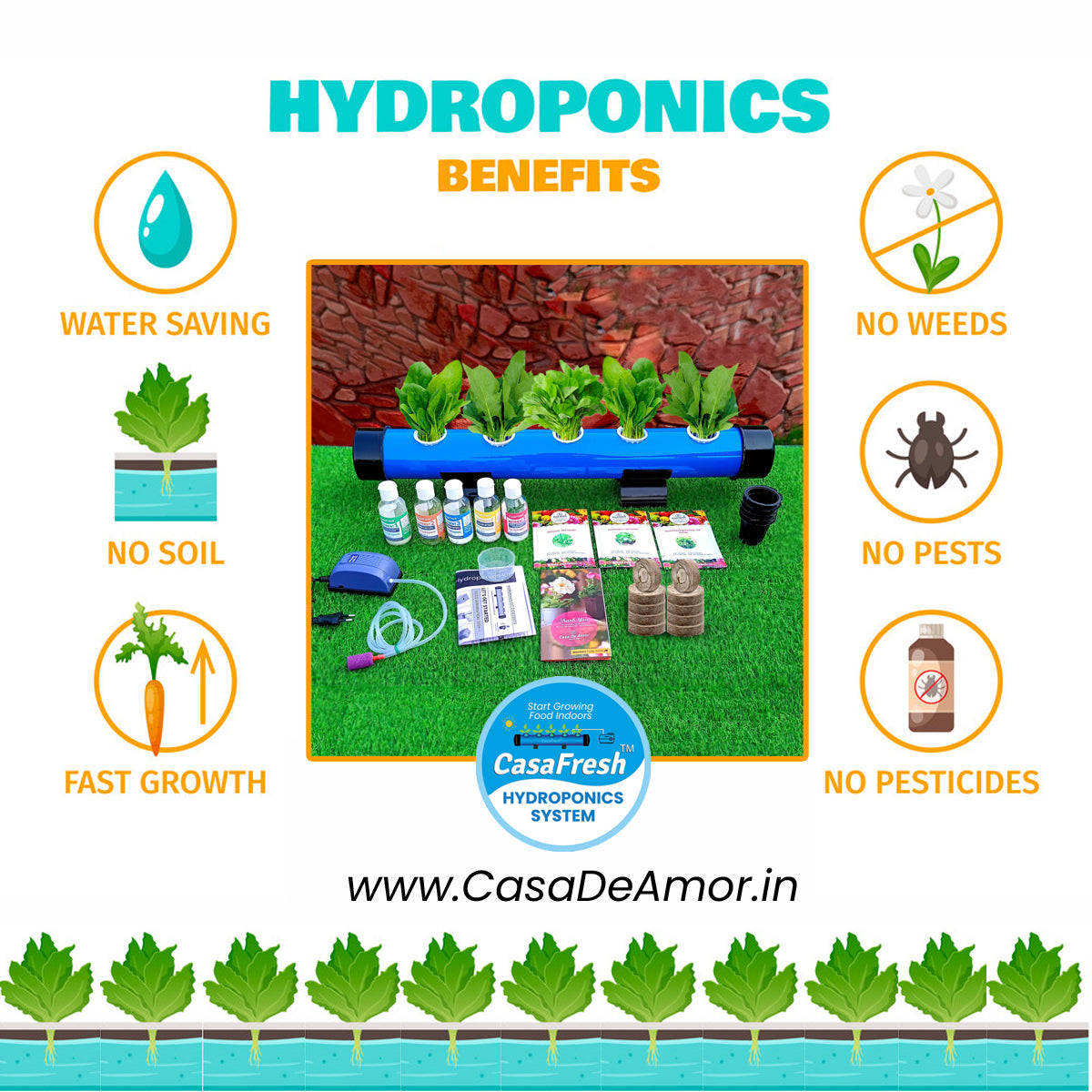 - COMPATIBLE PLANTS – Grow any green leafy VEGETABLES (like Lettuce, Spinach, Basil, Mint, etc) HERBS (like Oregano, Thyme, etc), and SALADS easily with Casapipe.