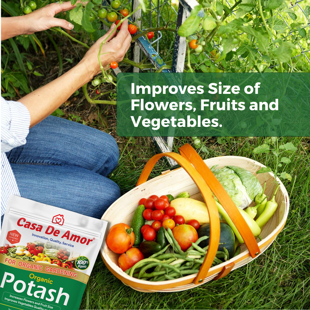 This organic potash fertilizer is specially designed to improve the size of your flowers, fruits, and vegetables, giving you a bountiful harvest that will have all your friends and neighbors green with envy.